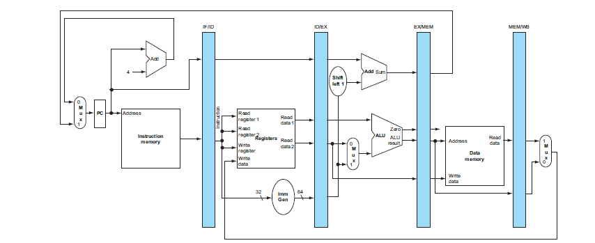 Pipeline register 的功能,是在每個 clock cycle 結束時,儲存該 stage 的輸出資料與對應的控制資訊,並在下一個 cycle 將這些穩定的值提供給下一個 stage 使用。藉由這種「先存、再用」的機制,多條指令才能在同一條 datapath 上同時處於不同 stages,讓 pipeline 在時間上並行運作,而結果仍然正確。