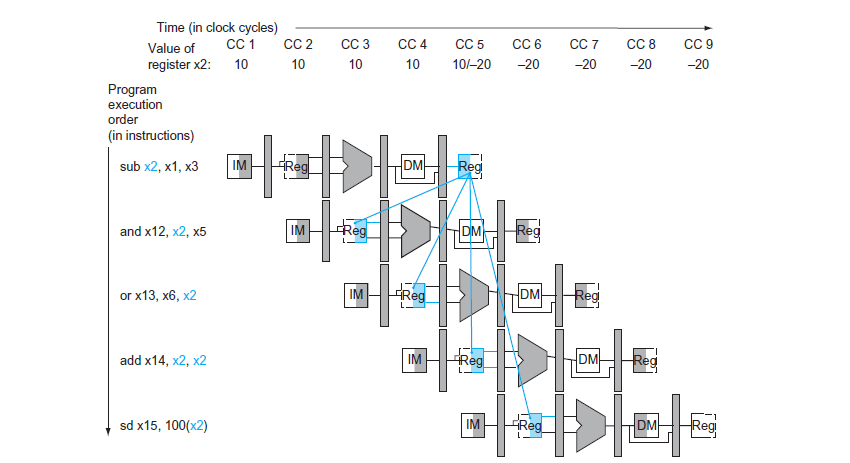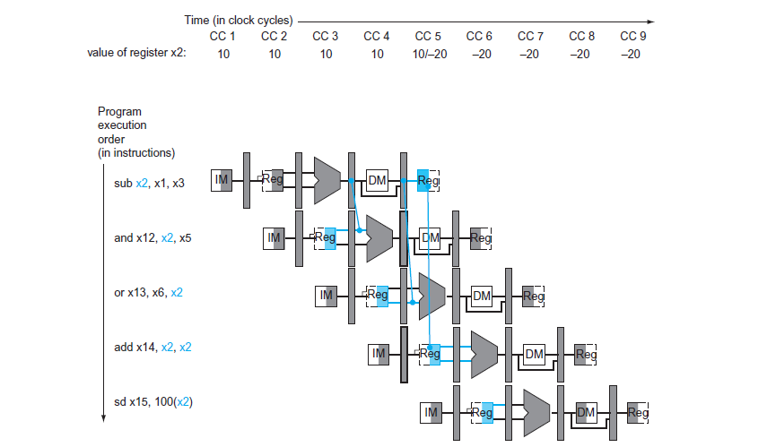 - 這裡的解決方式是使用 Forwarding,將 ALU 的結果直接 Forward 給需要的指令,避免等待寫回 Register 的時間,這樣 and, or, add 三個使用 x2 的指令就可以在 CC 6, 7, 8 執行,而不需要等待到 CC 5 之後才能執行