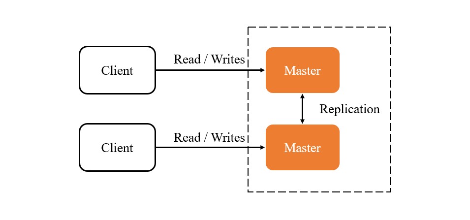 既然 Master-Slave 的架構中寫入依然受限於 Master 節點的性能,那麼我們可以考慮讓多個 Master 節點同時處理寫入操作,這就是 Master-Master Replication